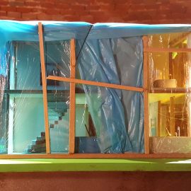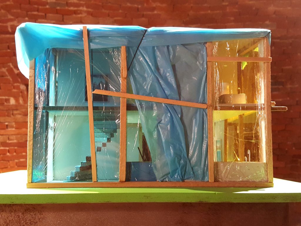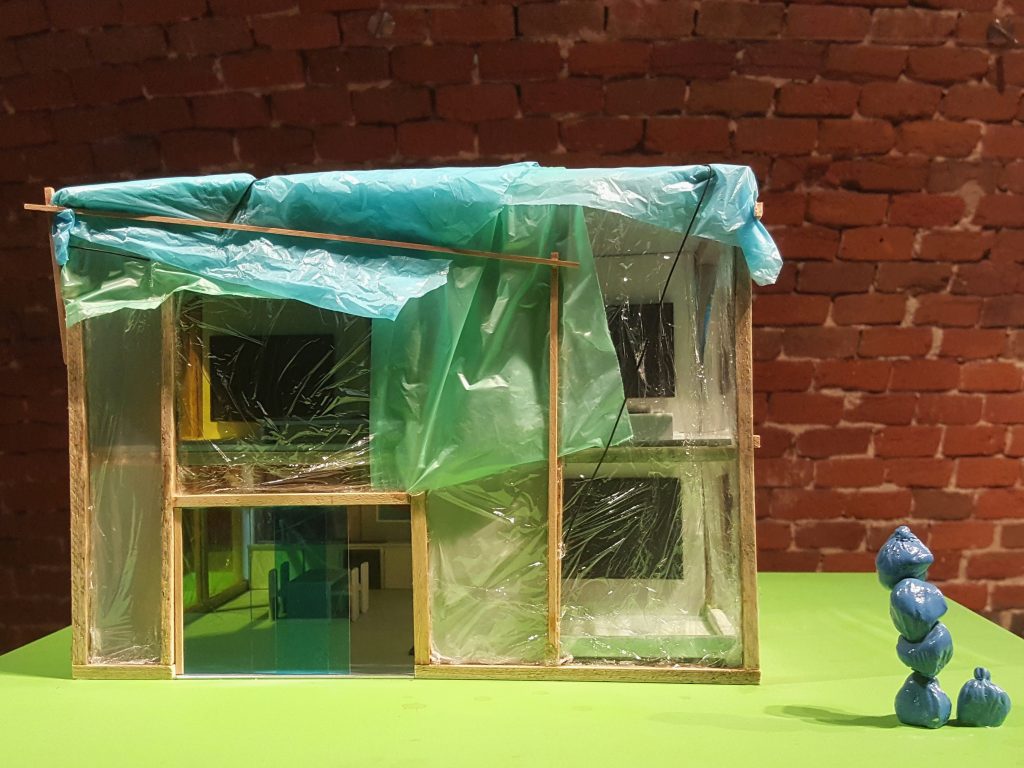 The house of a refugee camp built from garbage becomes a design object. It illustrates „social washing“ in the field of architecture. Shelters become villas, garbage bags become garden sculptures and a good concience and the toilet paper never runs out.